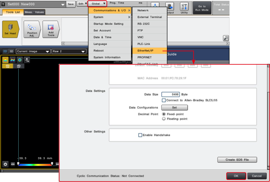 From the controller, select “Global Settings”> “Communications & I/O” > “EtherNet/IP” and confirm “Cyclic Communication Status” shown in the bottom part of the “EtherNet/IP” screen. If “Not Connected” is displayed here, it means that the establishment of communication failed. Please reconfirm the cable connection status, IP address, communication settings on the PLC side, etc.