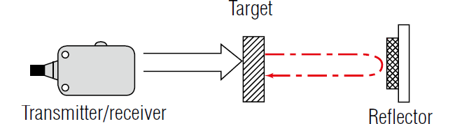 Detection occurs when the target crosses the optical axis between sensor head and reflector.