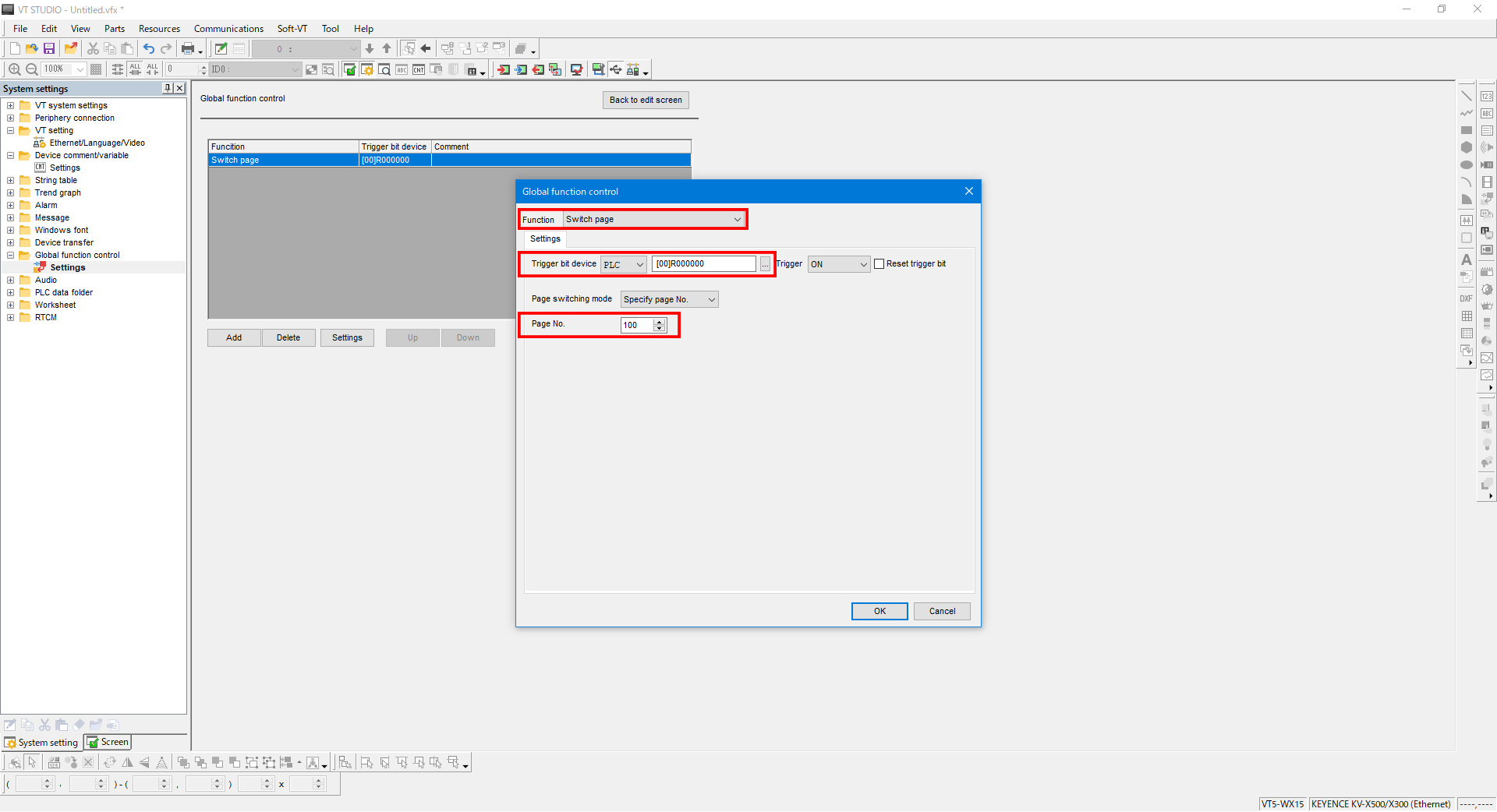 3. The example settings in the following figure are for changing to the screen of page number 100 when R000000 is set to ON.