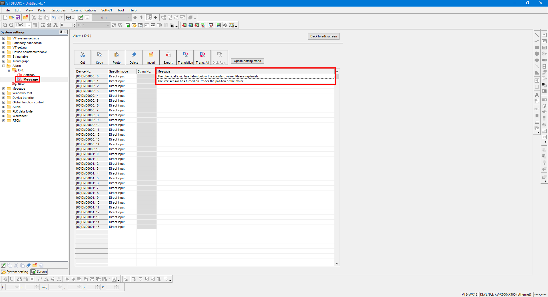 5. On the “Key entry” tab, configure the settings as shown below. With the following settings, you can tap the alarm that has occurred to display a pop-up window containing the countermeasure for the alarm.
